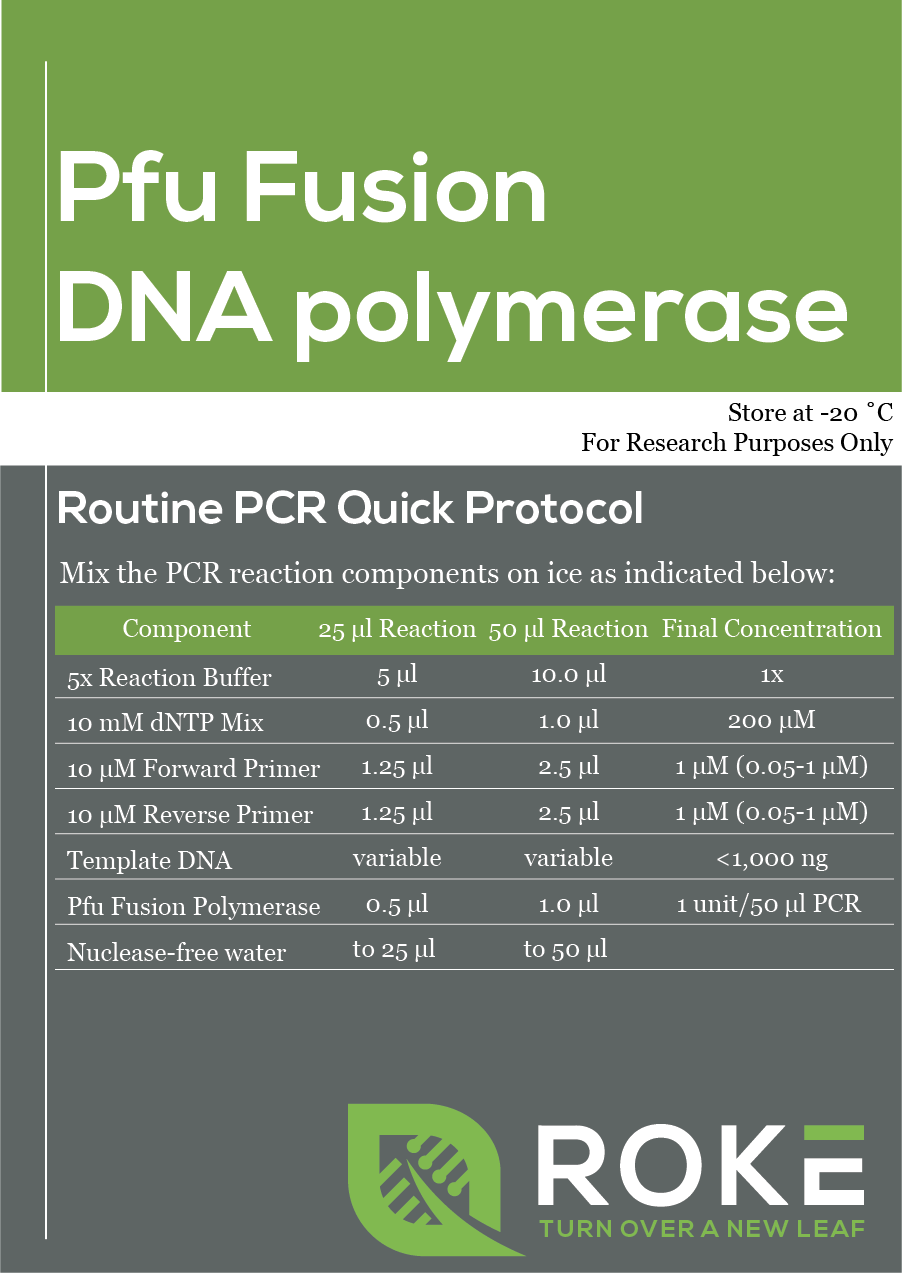 This high fidelity DNA Polymerase is a thermostable enzyme engineered from Pyrococcus furiosus, by fusing it with the small, non‑specific DNA‑binding protein Sso7d from Sulfolobus solfataricus. This fusion significantly enhances the enzyme’s processivity and performance while preserving its 5′→3′ polymerase activity and intrinsic 3′→5′ proofreading exonuclease activity. As a result, Pfu‑sso7d generates highly accurate PCR products with substantially reduced error rate (>30x less errors than Taq DNA polymerase), making it an ideal choice for cloning, site‑directed mutagenesis, and other applications that demand low-error DNA amplification, even from complex or GC‑rich templates.